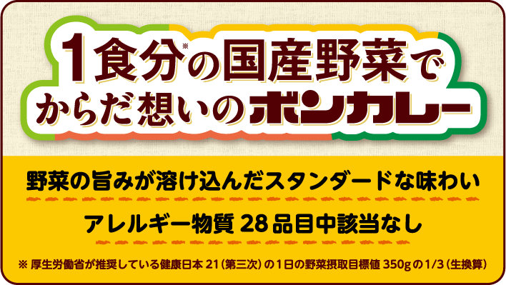 さまざまな食のスタイルへ対応!野菜の旨みが溶け込んだスタンダードな味わいの「1食分の国産野菜でからだ想いのボンカレー」3月2日から新発売